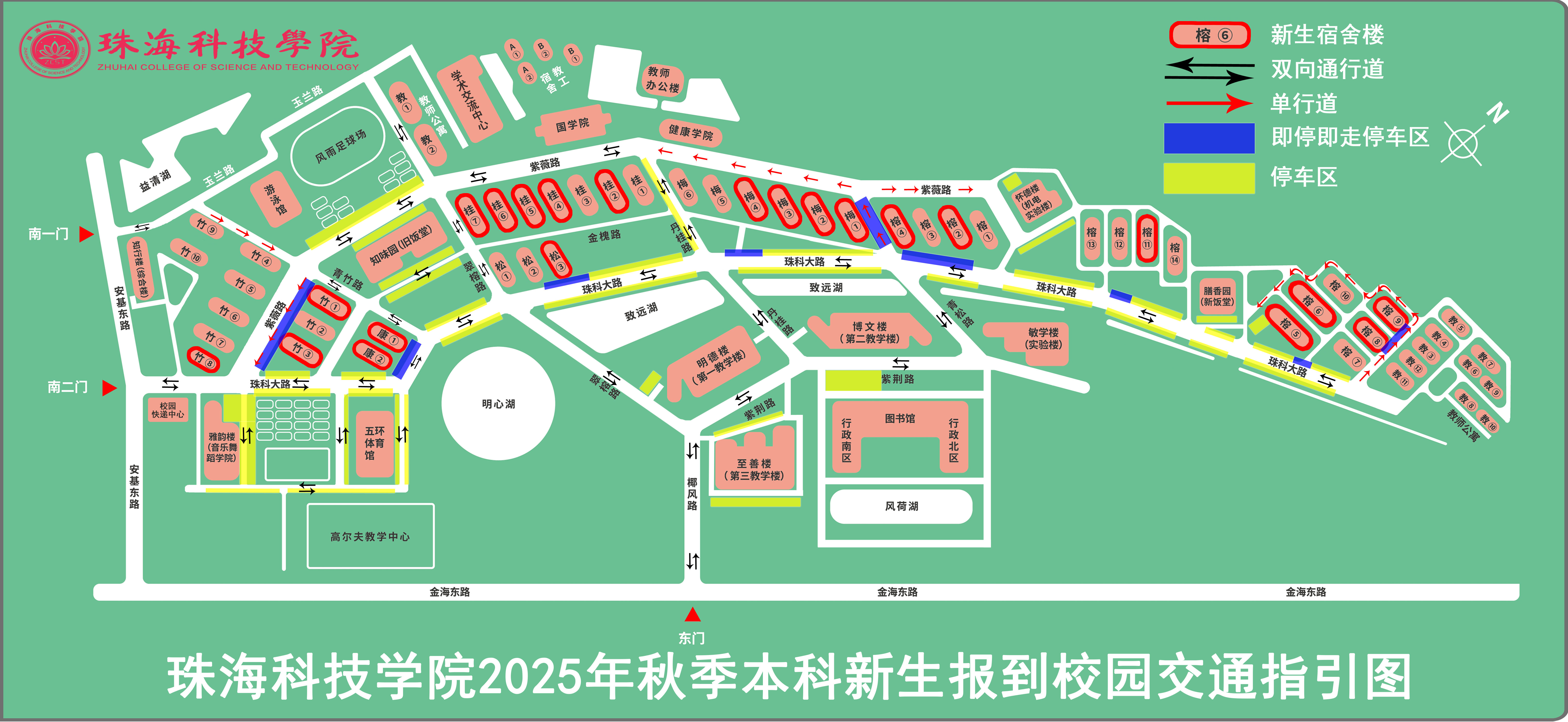 (一)迎新期间校内道路设置多处单行路段(详见珠海科技学院2025年秋季本科新生报到校园交通指引图),所有机动车辆进入校园后需严格按照交通示意图、指引牌指示的方向、路线行驶,不得在校园内超速、随意穿行、乱停乱放、堵塞通道等,进入校园的机动车建议将车主电话放置于车辆挡风玻璃处,便于紧急情况时及时联系到车主。