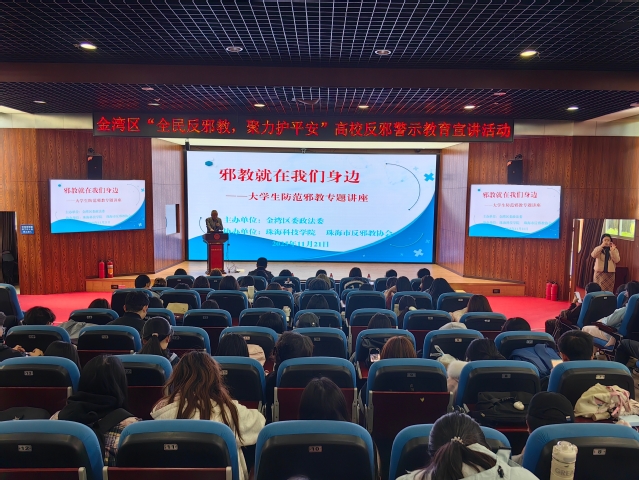 为切实增强全校师生识别、抵制邪教的意识和能力,筑牢思想防线,营造安全、健康、文明的校园环境,2025年11月21日,学校联合金湾区委政法委在明德楼B108报告厅开展“全民反邪教,聚力护平安”反邪警示教育宣传讲座活动。本次活动邀请到珠海市反邪教协会副会长杨树为师生进行专题宣讲,讲座由保卫处副处长薛嘉升主持。