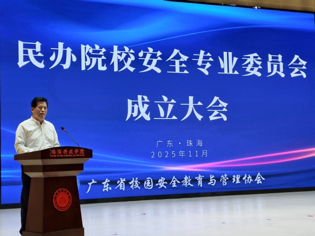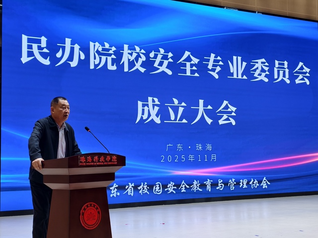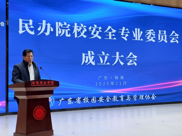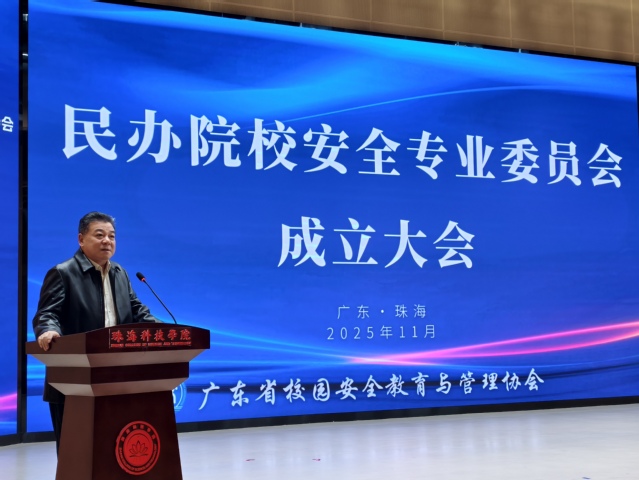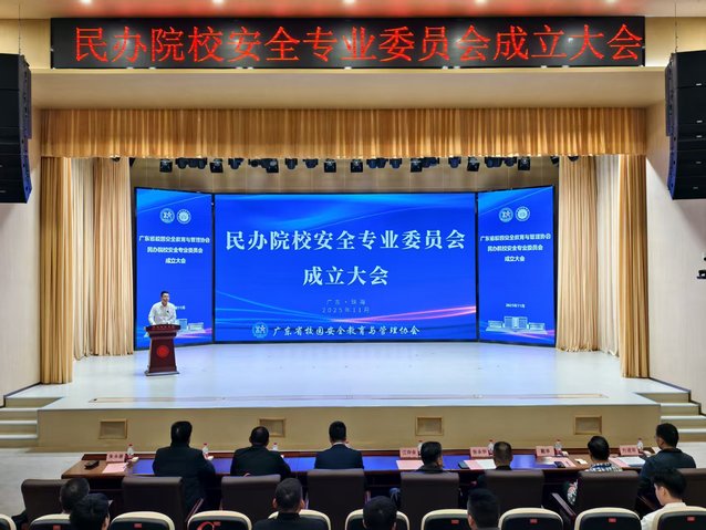为凝聚全省民办院校安全管理智慧,提升校园安全防范能力,夯实教育高质量发展的安全根基,11月26日,广东省校园安全教育与管理协会民办院校安全专业委员会(以下简称专委会)成立大会在学校国学院报告厅召开。广东省教育厅安保处处长江存余、广东省校园安全教育与管理协会会长张永华、学校党委委员、纪委书记、副校长黄学寿,广东省校园安全教育与管理协会常务副会长兼秘书长、广东外语外贸大学党委保卫部部长余泽浩,广东省校园安全教育与管理协会常务副会长戴亭,广东省校园安全教育与管理协会常务理事、广东岭南职业技术学院党委保卫工作部部长、保卫处处长龙旭,广东省校园安全教育与管理协会监事、广州市白云区白云外国语学校党总支书记、校长方建军,以及全省各民办院校相关负责同志出席大会。会议由珠海科技学院党委保卫部部长、保卫处处长朱永康主持。