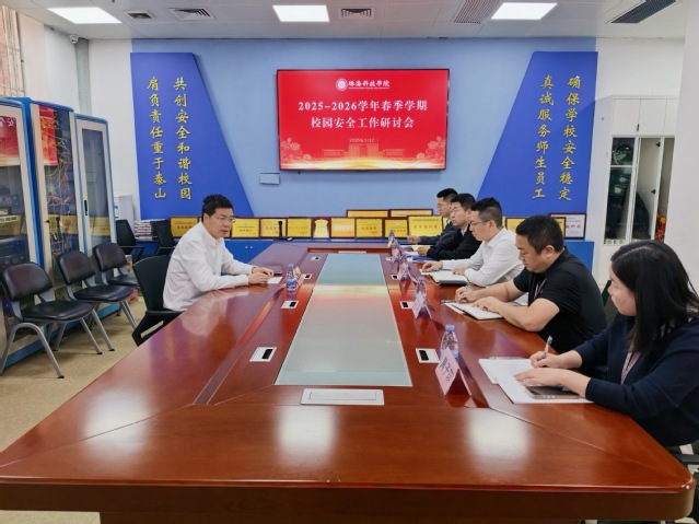 为深入、高效做好新学期学校安全工作,提升校园整体安全管理水平,2026年3月2日上午,学校在校园监控中心召开2025-2026学年春季学期校园安全工作研讨会,党委委员、纪委书记、副校长黄学寿出席会议,保卫处处长朱永康,副处长沈方龙、薛嘉升,户籍内勤科科长黄子苡,治安科科长黎开臻参加会议。