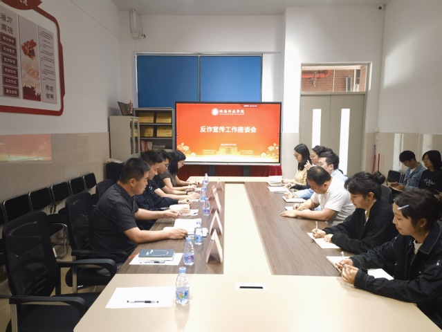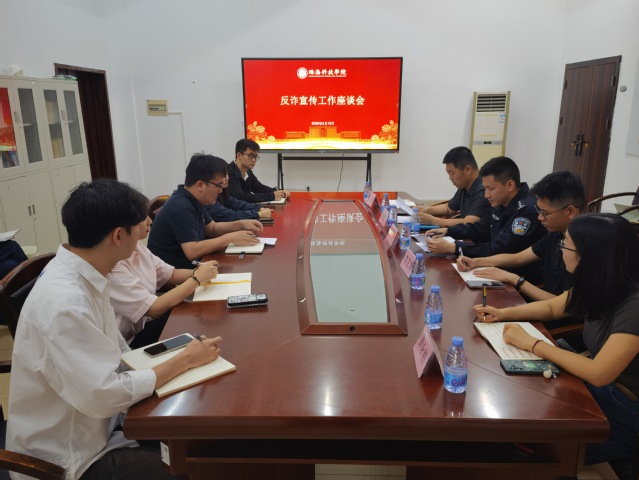 为进一步筑牢校园反诈防线,切实守护学生财产安全,提升校园反诈宣传教育的针对性与实效性,2026年3月19日上午,学校保卫处联合珠海市公安局金湾分局金海岸派出所、三灶镇平安法治办公室,深入二级学院,组织召开反诈宣传工作座谈会。金海岸派出所副所长萧永光,三灶镇平安法治办公室工作人员赵正浩、黄永胜,学校相关学院学工办主任,辅导员代表以及保卫处工作人员参加座谈会,保卫处副处长薛嘉升主持会议。